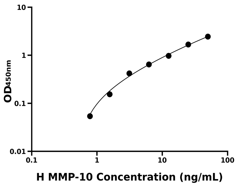本试剂盒采用双抗体夹心法ELISA技术:将捕获抗体包被于酶标板上,捕获样品及标准品中的待测物MMP-10,清洗后,再加入生物素标记的检测抗体进行孵育后清洗,形成“捕获抗体-抗原-检测抗体”免疫复合物,随后加入链霉亲和素偶联的辣根过氧化物酶进行孵育,待孵育结束后清洗,接着加入TMB显色后,若样本中有待测物则显蓝色,加入终止液停止反应。检测过程中游离的成分均被洗去,用酶标仪在450 nm处测OD值,颜色的深浅和样品中的待测物的含量呈正比,通过绘制标准曲线计算出样本中MMP-10的浓度。