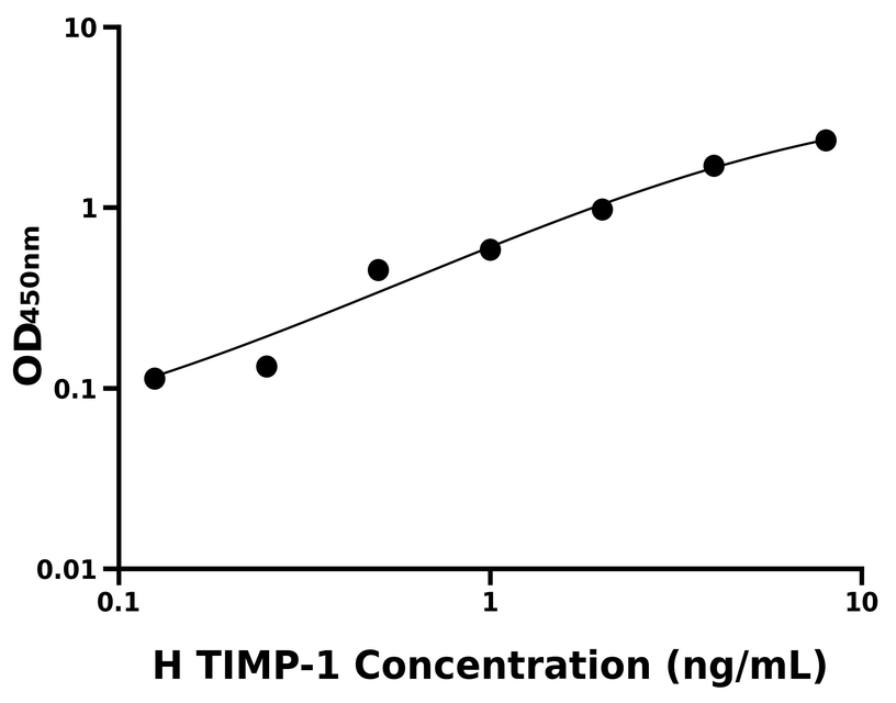 本试剂盒采用双抗体夹心法ELISA技术:将捕获抗体包被于酶标板上,捕获样品及标准品中的待测物TIMP-1,清洗后,再加入生物素标记的检测抗体进行孵育后清洗,形成“捕获抗体-抗原-检测抗体”免疫复合物,随后加入链霉亲和素偶联的辣根过氧化物酶进行孵育,待孵育结束后清洗,接着加入TMB显色后,若样本中有待测物则显蓝色,加入终止液停止反应。检测过程中游离的成分均被洗去,用酶标仪在450 nm处测OD值,颜色的深浅和样品中的待测物的含量呈正比,通过绘制标准曲线计算出样本中TIMP-1的浓度。