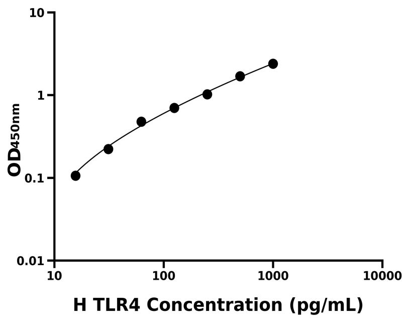 本试剂盒采用双抗体夹心法ELISA技术:将捕获抗体包被于酶标板上,捕获样品及标准品中的待测物TLR4,清洗后,再加入生物素标记的检测抗体进行孵育后清洗,形成“捕获抗体-抗原-检测抗体”免疫复合物,随后加入链霉亲和素偶联的辣根过氧化物酶进行孵育,待孵育结束后清洗,接着加入TMB显色后,若样本中有待测物则显蓝色,加入终止液停止反应。检测过程中游离的成分均被洗去,用酶标仪在450 nm处测OD值,颜色的深浅和样品中的待测物的含量呈正比,通过绘制标准曲线计算出样本中TLR4的浓度。