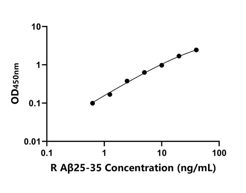本试剂盒采用双抗体夹心法ELISA技术:将捕获抗体包被于酶标板上,捕获样品及标准品中的待测物Aβ25-35,清洗后,再加入生物素标记的检测抗体进行孵育后清洗,形成“捕获抗体-抗原-检测抗体”免疫复合物,随后加入链霉亲和素偶联的辣根过氧化物酶进行孵育,待孵育结束后清洗,接着加入TMB显色后,若样本中有待测物则显蓝色,加入终止液停止反应。检测过程中游离的成分均被洗去,用酶标仪在450 nm处测OD值,颜色的深浅和样品中的待测物的含量呈正比,通过绘制标准曲线计算出样本中Aβ25-35的浓度。