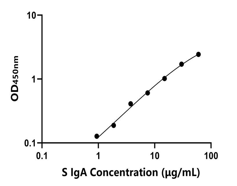 本试剂盒采用双抗体夹心法ELISA技术:将捕获抗体包被于酶标板上,捕获样品及标准品中的待测物IgA,清洗后,再加入生物素标记的检测抗体进行孵育后清洗,形成“捕获抗体-抗原-检测抗体”免疫复合物,随后加入链霉亲和素偶联的辣根过氧化物酶进行孵育,待孵育结束后清洗,接着加入TMB显色后,若样本中有待测物则显蓝色,加入终止液停止反应。检测过程中游离的成分均被洗去,用酶标仪在450 nm处测OD值,颜色的深浅和样品中的待测物的含量呈正比,通过绘制标准曲线计算出样本中IgA的浓度。