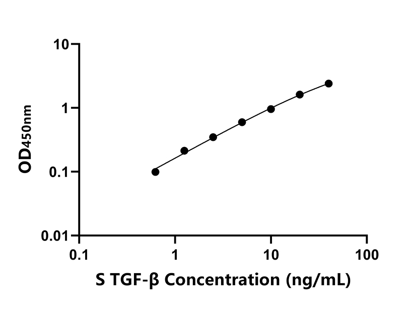 本试剂盒采用双抗体夹心法ELISA技术:将捕获抗体包被于酶标板上,捕获样品及标准品中的待测物TGF-β,清洗后,再加入生物素标记的检测抗体进行孵育后清洗,形成“捕获抗体-抗原-检测抗体”免疫复合物,随后加入链霉亲和素偶联的辣根过氧化物酶进行孵育,待孵育结束后清洗,接着加入TMB显色后,若样本中有待测物则显蓝色,加入终止液停止反应。检测过程中游离的成分均被洗去,用酶标仪在450 nm处测OD值,颜色的深浅和样品中的待测物的含量呈正比,通过绘制标准曲线计算出样本中TGF-β的浓度。