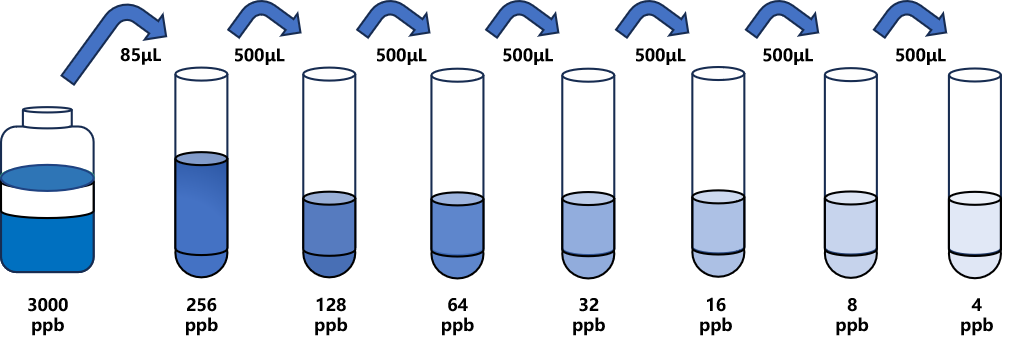 试剂盒中取出标准品,准备7个试管,先将3000 ppb标准品(200µL)按需吸取一定量用1×稀释液稀释至256 ppb(例:85µL的标准品母液+915µL的1×稀释液,制备得到1000μL的256 ppb浓度标准品),随后在6个试管中分别加入500μL的1×稀释液,在这6个单独的试管中将256 ppb标准品依次2倍倍比稀释至7个梯度,共配制7个浓度的标准品,依次为:256 ppb、128 ppb、64 ppb、32 ppb、16 ppb、8 ppb、4 ppb,从最高浓度标准品溶液中吸取500μL标准品到下一个试管中,轻轻吹打混匀,以此类推进行标准品的倍比稀释(如图所示),1×稀释液用作零浓度标准品(0ppb)。