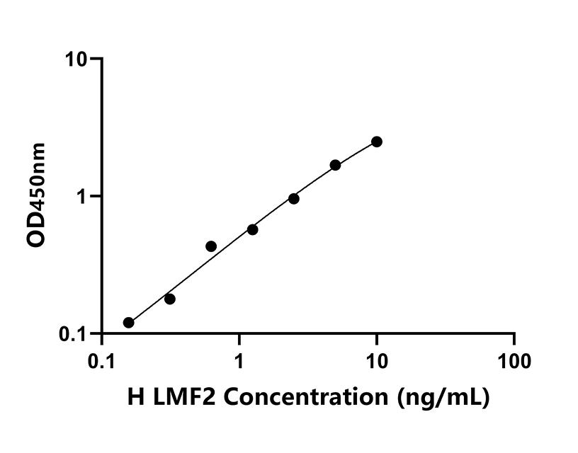 本试剂盒采用双抗体夹心法ELISA技术:将捕获抗体包被于酶标板上,捕获样品及标准品中的待测物LMF2,清洗后,再加入生物素标记的检测抗体进行孵育后清洗,形成“捕获抗体-抗原-检测抗体”免疫复合物,随后加入链霉亲和素偶联的辣根过氧化物酶进行孵育,待孵育结束后清洗,接着加入TMB显色后,若样本中有待测物则显蓝色,加入终止液停止反应。检测过程中游离的成分均被洗去,用酶标仪在450 nm处测OD值,颜色的深浅和样品中的待测物的含量呈正比,通过绘制标准曲线计算出样本中LMF2的浓度。