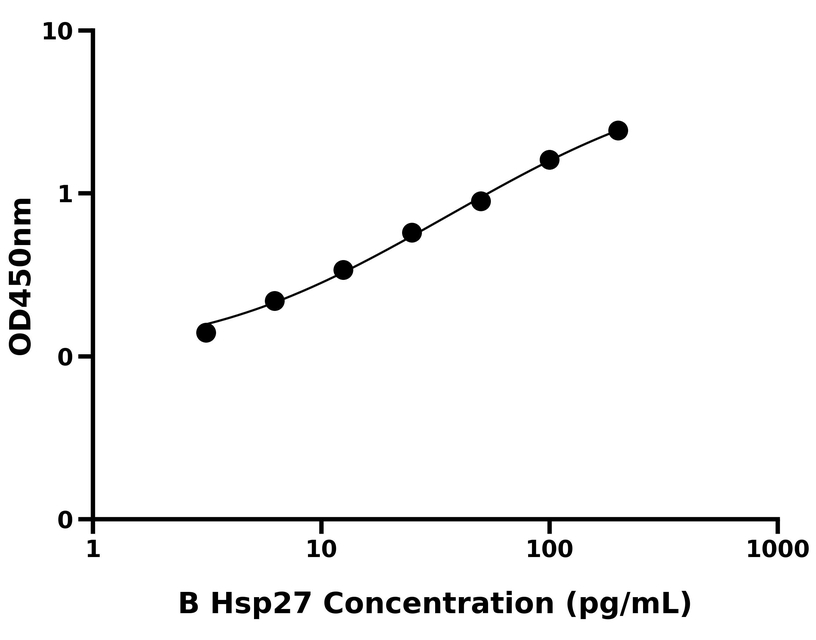 本试剂盒采用双抗体夹心法ELISA技术:将捕获抗体包被于酶标板上,捕获样品及标准品中的待测物Hsp27,清洗后,再加入生物素标记的检测抗体进行孵育后清洗,形成“捕获抗体-抗原-检测抗体”免疫复合物,随后加入链霉亲和素偶联的辣根过氧化物酶进行孵育,待孵育结束后清洗,接着加入TMB显色后,若样本中有待测物则显蓝色,加入终止液停止反应。检测过程中游离的成分均被洗去,用酶标仪在450 nm处测OD值,颜色的深浅和样品中的待测物的含量呈正比,通过绘制标准曲线计算出样本中Hsp27的浓度。