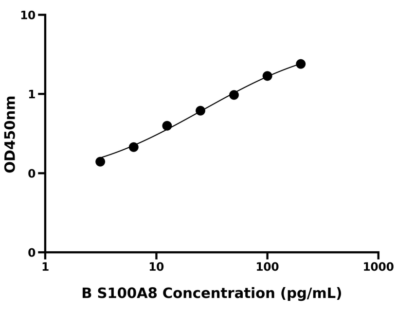 本试剂盒采用双抗体夹心法ELISA技术:将捕获抗体包被于酶标板上,捕获样品及标准品中的待测物S100A8,清洗后,再加入生物素标记的检测抗体进行孵育后清洗,形成“捕获抗体-抗原-检测抗体”免疫复合物,随后加入链霉亲和素偶联的辣根过氧化物酶进行孵育,待孵育结束后清洗,接着加入TMB显色后,若样本中有待测物则显蓝色,加入终止液停止反应。检测过程中游离的成分均被洗去,用酶标仪在450 nm处测OD值,颜色的深浅和样品中的待测物的含量呈正比,通过绘制标准曲线计算出样本中S100A8的浓度。