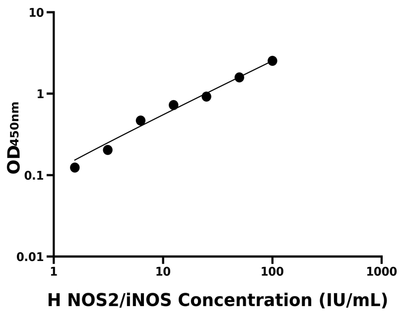本试剂盒采用双抗体夹心法ELISA技术:将捕获抗体包被于酶标板上,捕获样品及标准品中的待测物NOS2/iNOS,清洗后,再加入生物素标记的检测抗体进行孵育后清洗,形成“捕获抗体-抗原-检测抗体”免疫复合物,随后加入链霉亲和素偶联的辣根过氧化物酶进行孵育,待孵育结束后清洗,接着加入TMB显色后,若样本中有待测物则显蓝色,加入终止液停止反应。检测过程中游离的成分均被洗去,用酶标仪在450 nm处测OD值,颜色的深浅和样品中的待测物的含量呈正比,通过绘制标准曲线计算出样本中NOS2/iNOS的浓度。