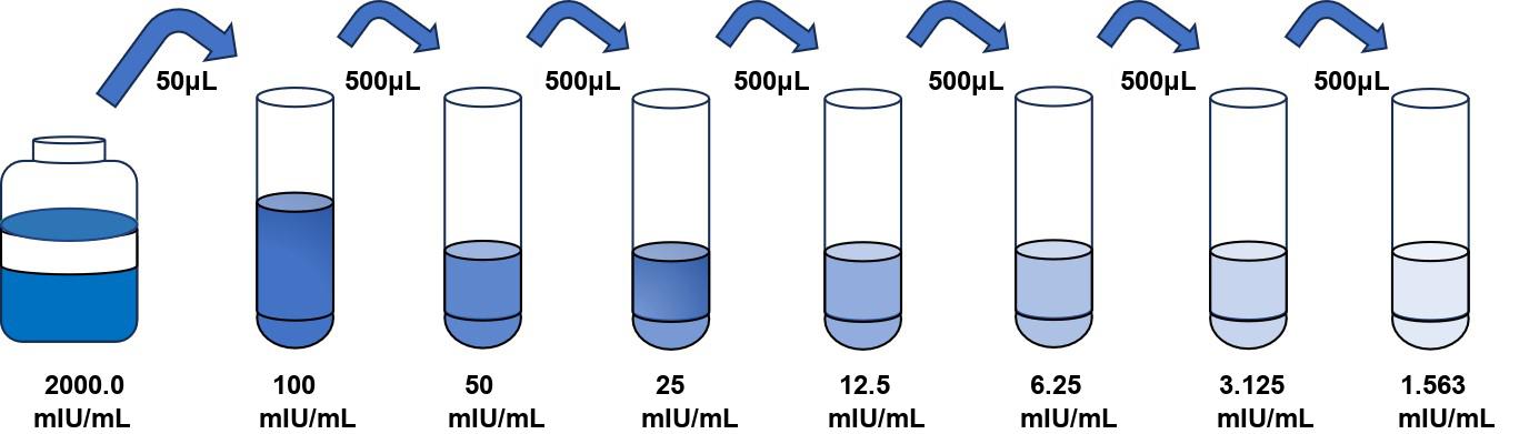 标准品配置:试剂盒中取出标准品,准备7个试管,先从2000.0mIU/mL标准品(200μL)按需吸取一定量用1×稀释液稀释至100mIU/mL(例:50μL的标准品母液+950μL的1×稀释液,制备得到1000μL的100mIU/mL浓度标准品),随后在6个试管中分别加入500μL的1×稀释液,在这6个单独的试管中将100mIU/mL标准品依次2倍倍比稀释至6个梯度,共配制7个浓度的标准品,依次为: 100mIU/mL、50mIU/mL、25mIU/mL、12.5mIU/mL、6.25mIU/mL、3.125mIU/mL、1.563mIU/mL,从最高浓度标准品溶液中吸取500μL标准品到下一个试管中,轻轻吹打混匀,以此类推进行标准品的倍比稀释(如图所示),1×稀释液用作零浓度标准品(0mIU/mL)。