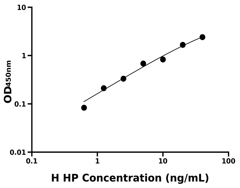 本试剂盒采用双抗体夹心法ELISA技术:将捕获抗体包被于酶标板上,捕获样品及标准品中的待测物HP,清洗后,再加入生物素标记的检测抗体进行孵育后清洗,形成“捕获抗体-抗原-检测抗体”免疫复合物,随后加入链霉亲和素偶联的辣根过氧化物酶进行孵育,待孵育结束后清洗,接着加入TMB显色后,若样本中有待测物则显蓝色,加入终止液停止反应。检测过程中游离的成分均被洗去,用酶标仪在450 nm处测OD值,颜色的深浅和样品中的待测物的含量呈正比,通过绘制标准曲线计算出样本中HP的浓度。