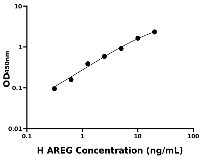 本试剂盒采用双抗体夹心法ELISA技术:将捕获抗体包被于酶标板上,捕获样品及标准品中的待测物AREG,清洗后,再加入生物素标记的检测抗体进行孵育后清洗,形成“捕获抗体-抗原-检测抗体”免疫复合物,随后加入链霉亲和素偶联的辣根过氧化物酶进行孵育,待孵育结束后清洗,接着加入TMB显色后,若样本中有待测物则显蓝色,加入终止液停止反应。检测过程中游离的成分均被洗去,用酶标仪在450 nm处测OD值,颜色的深浅和样品中的待测物的含量呈正比,通过绘制标准曲线计算出样本中AREG的浓度。