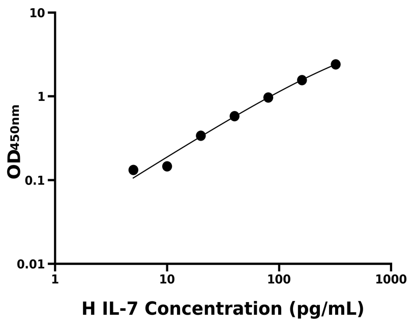 本试剂盒采用双抗体夹心法ELISA技术:将捕获抗体包被于酶标板上,捕获样品及标准品中的待测物IL-7,清洗后,再加入生物素标记的检测抗体进行孵育后清洗,形成“捕获抗体-抗原-检测抗体”免疫复合物,随后加入链霉亲和素偶联的辣根过氧化物酶进行孵育,待孵育结束后清洗,接着加入TMB显色后,若样本中有待测物则显蓝色,加入终止液停止反应。检测过程中游离的成分均被洗去,用酶标仪在450 nm处测OD值,颜色的深浅和样品中的待测物的含量呈正比,通过绘制标准曲线计算出样本中IL-7的浓度。