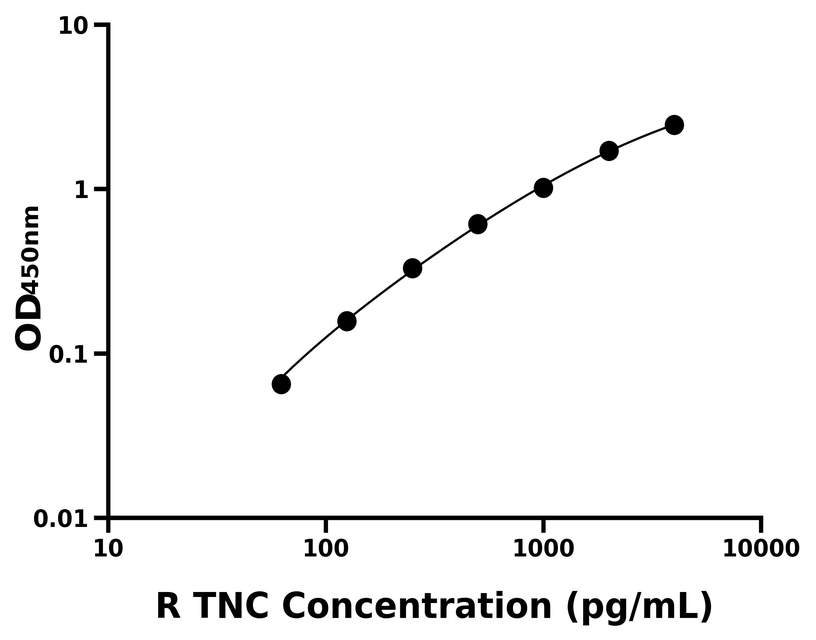 本试剂盒采用双抗体夹心法ELISA技术:将捕获抗体包被于酶标板上,捕获样品及标准品中的待测物TNC,清洗后,再加入生物素标记的检测抗体进行孵育后清洗,形成“捕获抗体-抗原-检测抗体”免疫复合物,随后加入链霉亲和素偶联的辣根过氧化物酶进行孵育,待孵育结束后清洗,接着加入TMB显色后,若样本中有待测物则显蓝色,加入终止液停止反应。检测过程中游离的成分均被洗去,用酶标仪在450 nm处测OD值,颜色的深浅和样品中的待测物的含量呈正比,通过绘制标准曲线计算出样本中TNC的浓度。