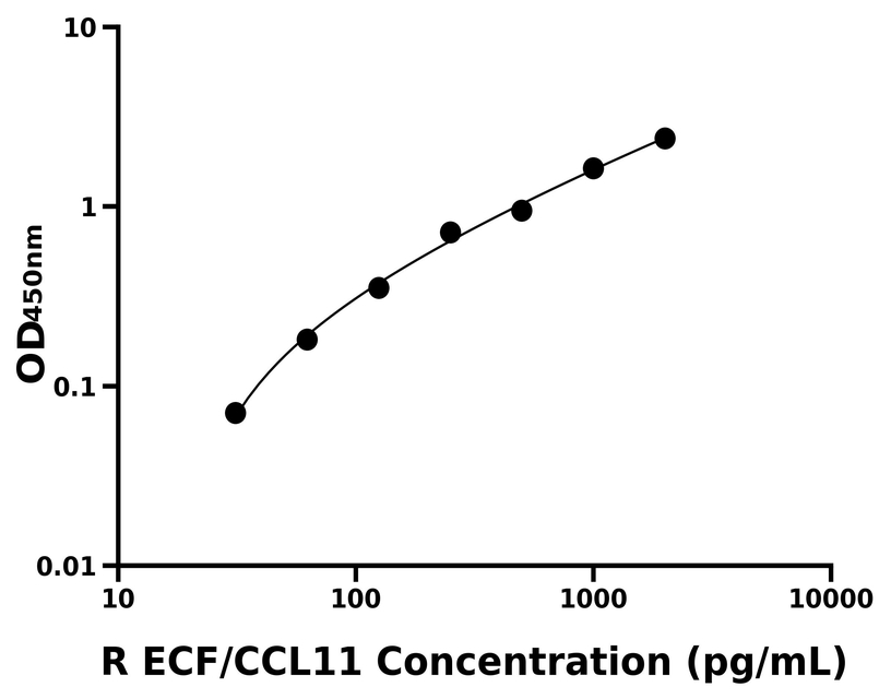 本试剂盒采用双抗体夹心法ELISA技术:将捕获抗体包被于酶标板上,捕获样品及标准品中的待测物ECF/CCL11,清洗后,再加入生物素标记的检测抗体进行孵育后清洗,形成“捕获抗体-抗原-检测抗体”免疫复合物,随后加入链霉亲和素偶联的辣根过氧化物酶进行孵育,待孵育结束后清洗,接着加入TMB显色后,若样本中有待测物则显蓝色,加入终止液停止反应。检测过程中游离的成分均被洗去,用酶标仪在450 nm处测OD值,颜色的深浅和样品中的待测物的含量呈正比,通过绘制标准曲线计算出样本中ECF/CCL11的浓度。