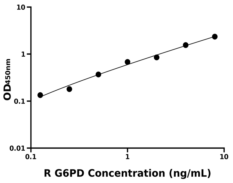 本试剂盒采用双抗体夹心法ELISA技术:将捕获抗体包被于酶标板上,捕获样品及标准品中的待测物G6PD,清洗后,再加入生物素标记的检测抗体进行孵育后清洗,形成“捕获抗体-抗原-检测抗体”免疫复合物,随后加入链霉亲和素偶联的辣根过氧化物酶进行孵育,待孵育结束后清洗,接着加入TMB显色后,若样本中有待测物则显蓝色,加入终止液停止反应。检测过程中游离的成分均被洗去,用酶标仪在450 nm处测OD值,颜色的深浅和样品中的待测物的含量呈正比,通过绘制标准曲线计算出样本中G6PD的浓度。