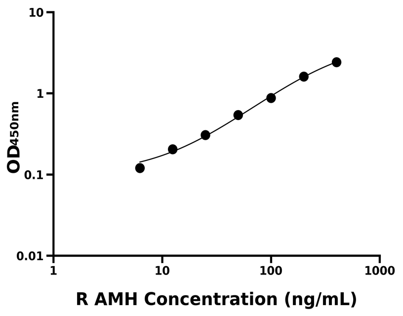 本试剂盒采用双抗体夹心法ELISA技术:将捕获抗体包被于酶标板上,捕获样品及标准品中的待测物AMH,清洗后,再加入生物素标记的检测抗体进行孵育后清洗,形成“捕获抗体-抗原-检测抗体”免疫复合物,随后加入链霉亲和素偶联的辣根过氧化物酶进行孵育,待孵育结束后清洗,接着加入TMB显色后,若样本中有待测物则显蓝色,加入终止液停止反应。检测过程中游离的成分均被洗去,用酶标仪在450 nm处测OD值,颜色的深浅和样品中的待测物的含量呈正比,通过绘制标准曲线计算出样本中AMH的浓度。