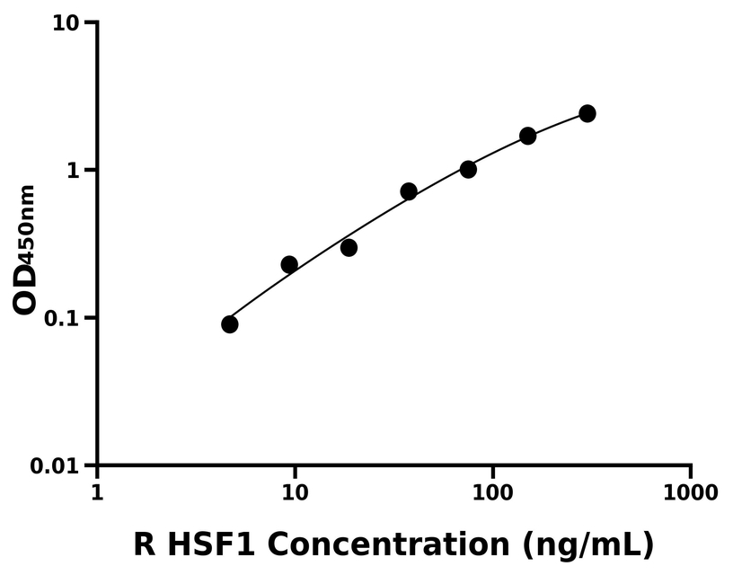 本试剂盒采用双抗体夹心法ELISA技术:将捕获抗体包被于酶标板上,捕获样品及标准品中的待测物HSF1,清洗后,再加入生物素标记的检测抗体进行孵育后清洗,形成“捕获抗体-抗原-检测抗体”免疫复合物,随后加入链霉亲和素偶联的辣根过氧化物酶进行孵育,待孵育结束后清洗,接着加入TMB显色后,若样本中有待测物则显蓝色,加入终止液停止反应。检测过程中游离的成分均被洗去,用酶标仪在450 nm处测OD值,颜色的深浅和样品中的待测物的含量呈正比,通过绘制标准曲线计算出样本中HSF1的浓度。