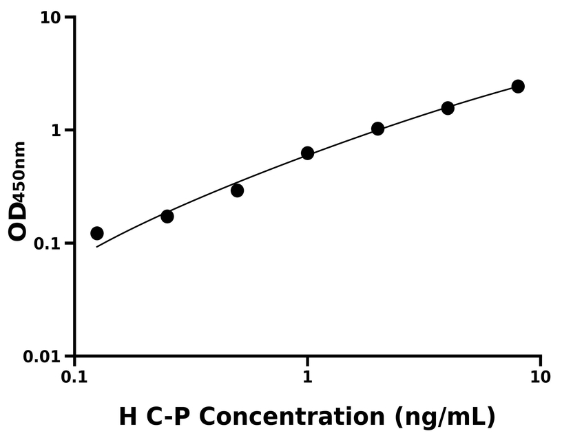 本试剂盒采用双抗体夹心法ELISA技术:将捕获抗体包被于酶标板上,捕获样品及标准品中的待测物C-P,清洗后,再加入生物素标记的检测抗体进行孵育后清洗,形成“捕获抗体-抗原-检测抗体”免疫复合物,随后加入链霉亲和素偶联的辣根过氧化物酶进行孵育,待孵育结束后清洗,接着加入TMB显色后,若样本中有待测物则显蓝色,加入终止液停止反应。检测过程中游离的成分均被洗去,用酶标仪在450 nm处测OD值,颜色的深浅和样品中的待测物的含量呈正比,通过绘制标准曲线计算出样本中C-P的浓度。